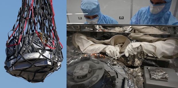 On Sept. 24, a helicopter carries the newly returned OSIRIS-REx capsule to a temporary clean room in Utah; three days later, scientists try to collect particles form the base of the sample canister at Johnson Space Center in Houston.
