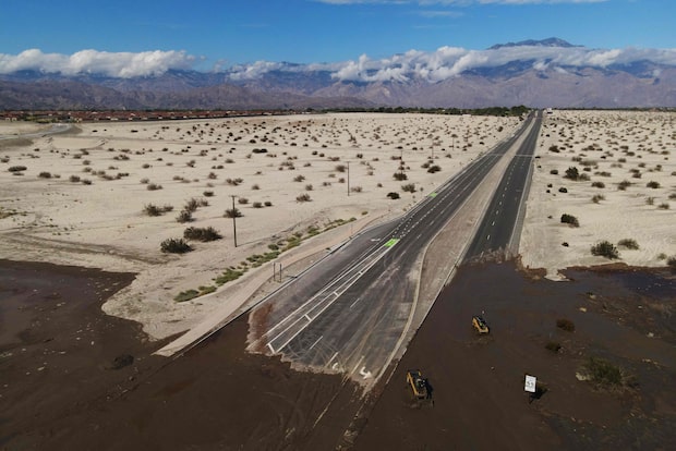 Mud blocks Interstate 10 in Racho Mirage, Calif., on Aug. 21, after Tropical Storm Hilary drenched California.