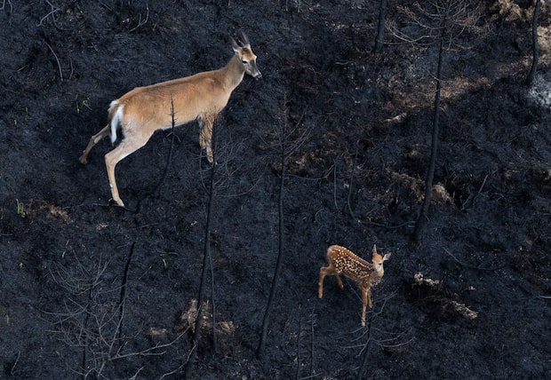 Deer look out at the burned woods near Shelburne, N.S., in June, after the wildfire season got off to an early and devastating start.