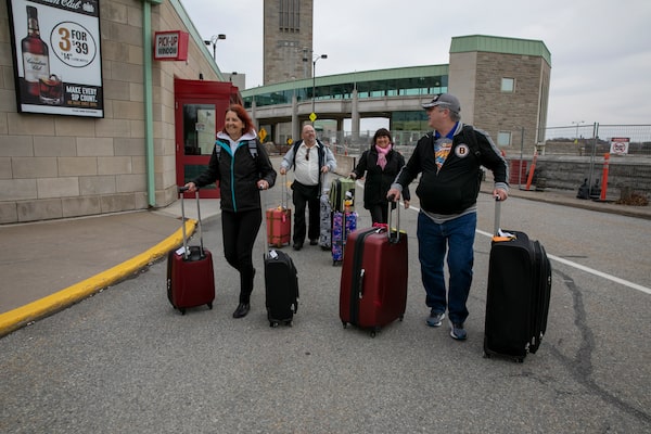 (L to R) Canadians Diane Parsons, Jose Pereira, Maria Dalaguit and Eric Parsons head out from the border after crossing the Rainbow Bridge in Niagara Falls on March 18, 2020 by foot.Deborah Baic/The Globe and Mail