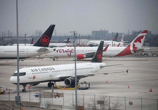 Air Canada planes sit on the tarmac at Toronto Pearson International Airport, Mar 19, 2020.Fred Lum