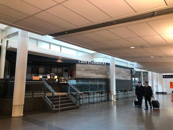 An air crew walks past an empty Starbucks at Montreal-Pierre Elliott Trudeau International Airport on March 17, 2020 in Montreal, Canada.JOCELYNE ZABLIT/AFP/Getty Images