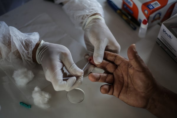 A nurse performs a coronavirus test on an indigenous man at Parque das Tribos community, on May 21, 2020 in Manaus, Brazil.Andre Coelho/Getty Images