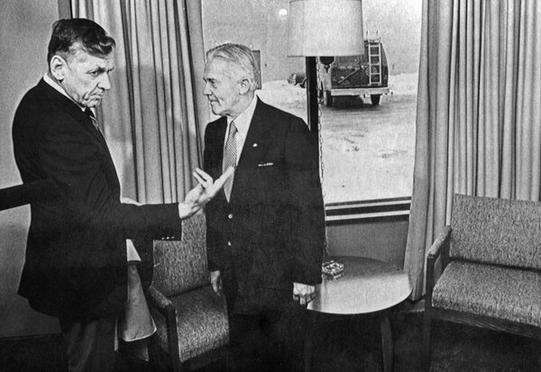 Harry Brandes, RCMP head of counterintelligence, shows coroner Stanislas Dery the empty chair, right, where former Canadian ambassador John Watkins died in 1964.Doug Ball/The Canadian Press