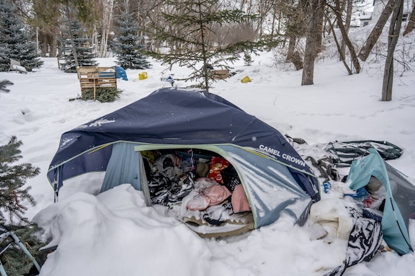 An encampment near McVicar Creek in Thunder Bay, February, 2025. The total number of homeless in the city rose from 557 in 2024 to 652 last year, with most living in encampments, emergency shelters and transitional housing.David Jackson/The Globe and Mail