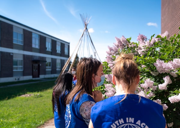 Hailey Scott smells lilacs growing in the yard of Dennis Franklin Cromarty High School. Last summer, council members volunteered to assist AlterEden with their garden, planted as a memorial to the seven northern Indigenous youth.DAVID JACKSON/The Globe and Mail
