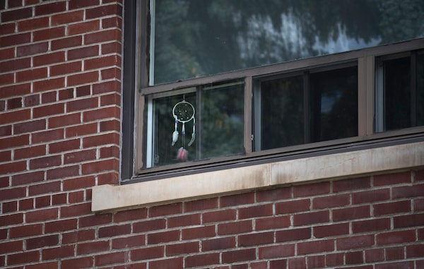 A dream catcher hangs in a second-floor window at the Matawa school. The institution has drivers on call to help students get home safely.