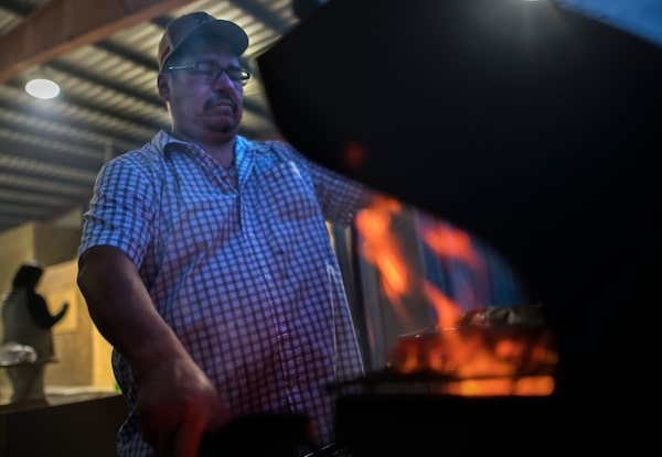 Wayne Moonias, Neskantaga's former chief, cooks burgers and hot dogs at a community barbecue. He has three children at the Matawa school.