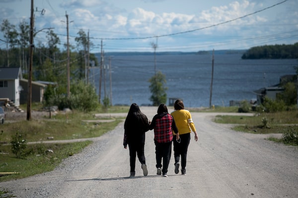 Three teenagers in the Oji-Cree community of Neskantaga go for a walk on a sunny day in August, a few weeks before their journey south to Thunder Bay. There, they and other First Nations youth from the region will attend the Matawa school, one of two Indigenous high schools in the city.Photography by Fred Lum/The Globe and Mail
