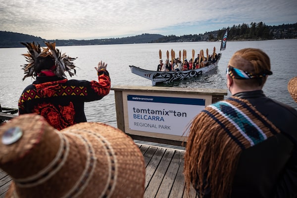 Gabriel George, back left, a member of the Tsleil-Waututh Nation, welcomes paddlers in a traditional canoe before a ceremony officially announcing the new park name of temtemixwten / Belcarra Regional Park, in Belcarra, B.C., on Oct. 8, 2021.DARRYL DYCK/The Globe and Mail