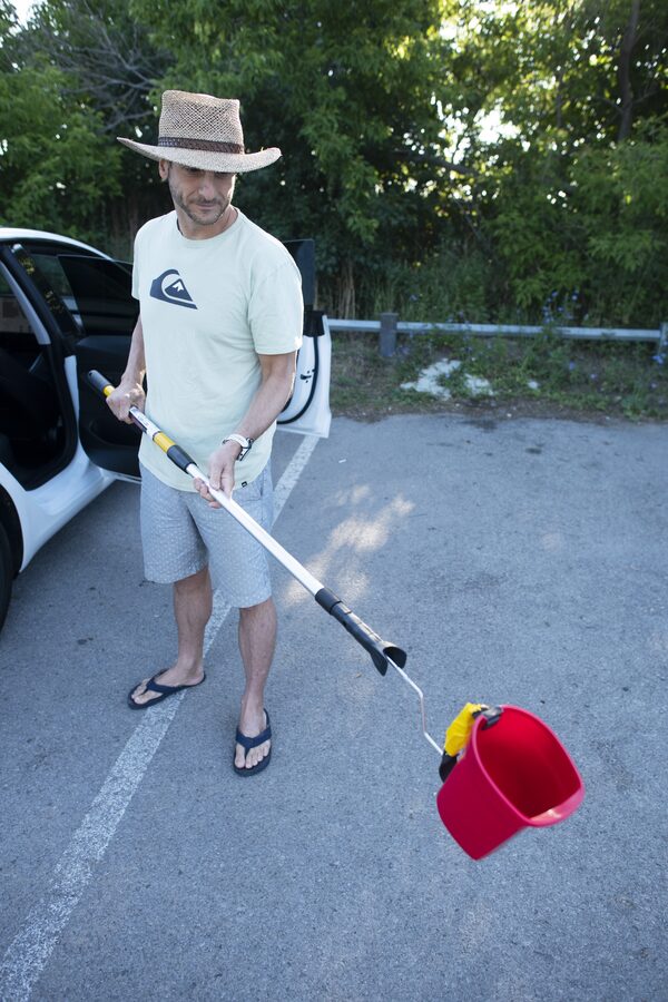 Mr. Maitinsky holds the homemade bucket that, in the water, allows him to trade items with his team without direct contact.
