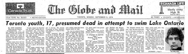 Sept. 9, 1974 – the 20-year anniversary of Marilyn Bell's arrival in Toronto – brought bad news about another athlete's attempted crossing of the lake.The Globe and Mail