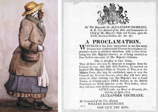 Rose Fortune, shown at left in a painting from around 1830, was a well known Black Loyalist in Annapolis Royal whose parents had been enslaved in Virginia. With proclamations like the one at right from the War of 1812, the British Empire encouraged Black people in the United States to settle in Nova Scotia and New Brunswick as free people.NOVA SCOTIA ARCHIVES AND RECORDS MANAGEMENT; LIBRARY OF CONGRESS