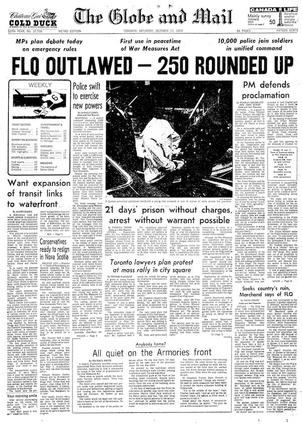 The Globe reports on the declaration of the War Measures Act during the 1970 October Crisis.