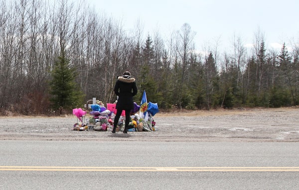 A woman pays her respects in front of the makeshift memorial that has been placed in the memory of Kristen Beaton, who was expecting her third child and was killed along Plains Road during last Sunday’s mass shooting in Nova Scotia.TIM KROCHAK/Reuters