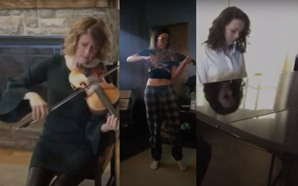 Fiddler Natalie MacMaster (left), shooting victim Emily Tuck (centre) and an unnamed pianist perform together via video editing during a livestream virtual vigil for the victims of the Nova Scotia shootings.Global News/Supplied