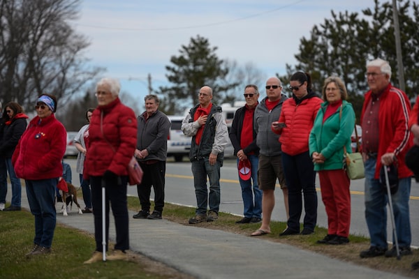 At the blocked-off access point to Portapique Beach Road, about 120 kilometres north of Halifax, where the violence began, some mourners appeared in medical masks as they placed paper hearts, stuffed animals and bouquets of flowers at the scene.