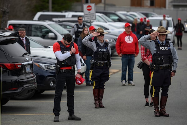 Members of the RCMP are emotional while paying their respects to slain RCMP Const. Heidi Stevenson, a 23-year member of the force and mother of two, during a moment of silence in front of her detachment, in Enfield, N.S., on April 24, 2020. Stevenson is one of the many victims killed by a gunman during a rampage through several rural communities in Nova Scotia.Darren Calabrese/The Globe and Mail