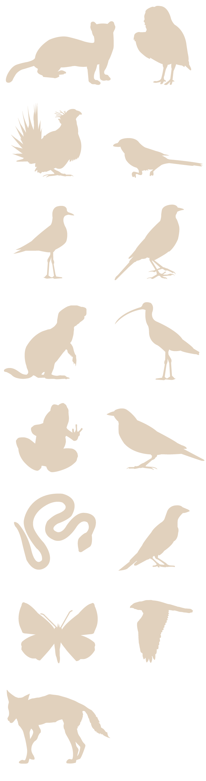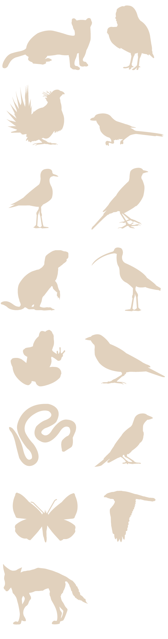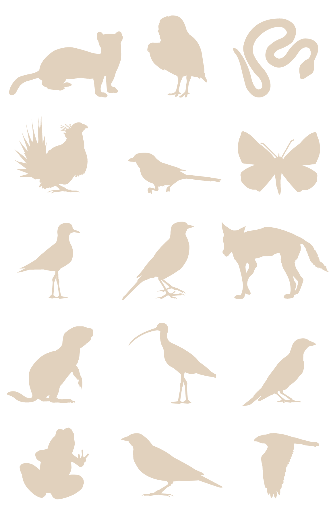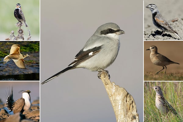 More than half of the 15 listed species in the SoD are birds. At middle is the prairie loggerhead shrike; at left, top to bottom, the chestnut-collared longspur, long-billed curlew and greater sage-grouse; at right, the McCown’s longspur, mountain plover and Sprague’s pipit.Environment Canada, IStockphoto, Associated Press, Dave Menke And Orin Balas, Skip Russell, Alamy Stock Photo, Seabamirum