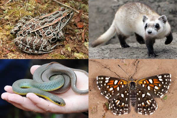 Clockwise from top left: a northern leopard frog, a black-footed ferret, a mormon metalmark and a yellow-bellied racer.Joplin Globe/AP, Reuters, Alamy Stock Photo