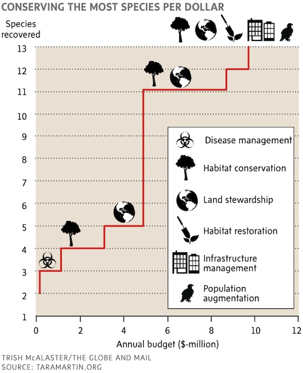 Dr. Martin has become Canada’s leading voice for what may seem like a coldly corporate take on conservation – one in which decisions are not based on which animals are most in need but on which strategies are most likely to provide the best return on investment. This method, which she calls “priority threat management,” approaches conservation almost as though various species were assets in a stock portfolio. “It’s very close to a basic cost-benefit analysis,” Dr. Martin says. “But instead of a monetary benefit, we’re thinking about the benefit to species' persistence.”