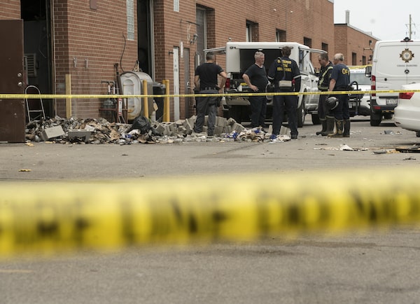 Members of the Fire Marshal's office and York Regional Police forensic team examine an arson scene at Pro Car Rental in Vaughan, Ont. on Monday June 22, 2020. The car rental business is owned Toronto Police Constable Ronald Joseph, 47, who is charged in connection with a tow truck crime ring.J.P. MOCZULSKI/THE GLOBE AND MAIL