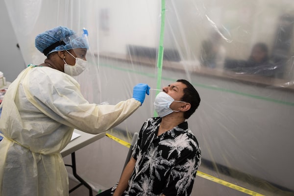 Registered nurse Emmanuella Ezeri performs a COVID-19 test at a temporary drop-in site at Crescent Town Health Centre in Toronto on May 26, 2020.Tijana Martin/The Globe and Mail