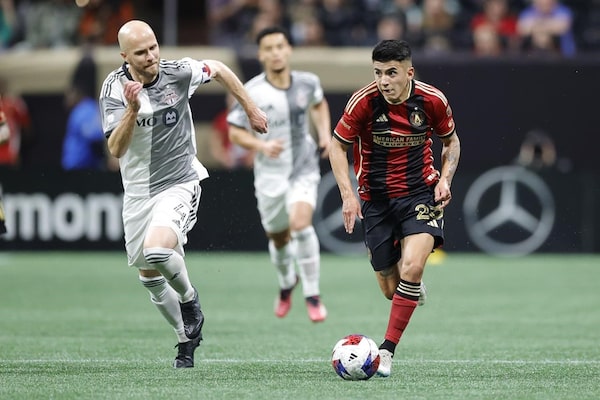 Atlanta United midfielder Thiago Almada, right, drives past Toronto FC midfielder Michael Bradley, left, during the second half on March 4, 2023, in Atlanta.The Associated Press