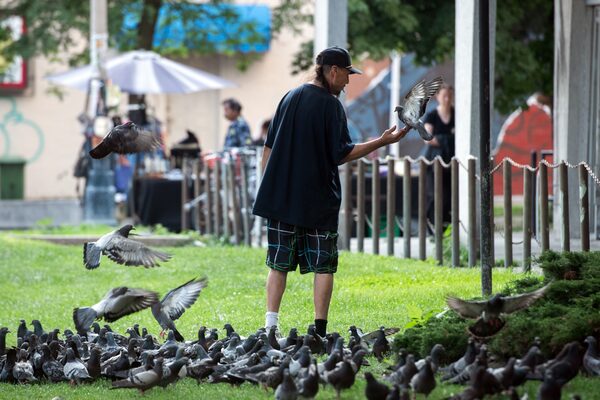 A man feeds pigeons outside a grocery store in Toronto, on July 13.Galit Rodan/The Globe and Mail