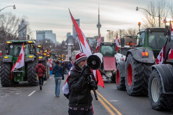 Tractors line up on a street leading to the Ontario Legislature during a Farmers in Support of Truckers protest, in Toronto on Feb. 4, 2022.Chris Young/The Canadian Press
