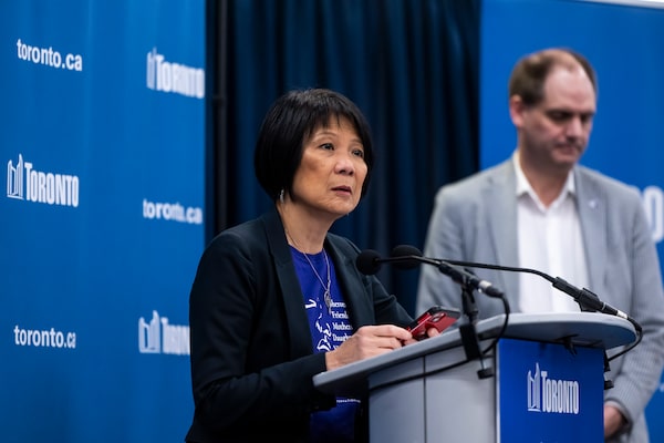 Toronto Mayor Olivia Chow speaks to reporters after a mass shooting near Scarborough Town Centre in Toronto, on March 8.Christopher Katsarov/The Canadian Press