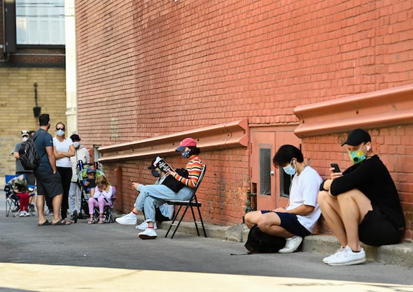 People sit in an alleyway and wait to enter a COVID-19 assessment centre at St. Michael's Hospital in Toronto on September 28, 2020.Nathan Denette/The Canadian Press
