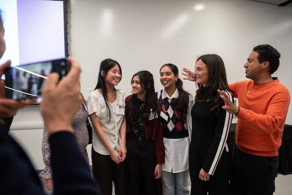 The winning team of students pose with Marissa and Moez Kassam.Galit Rodan/The Globe and Mail
