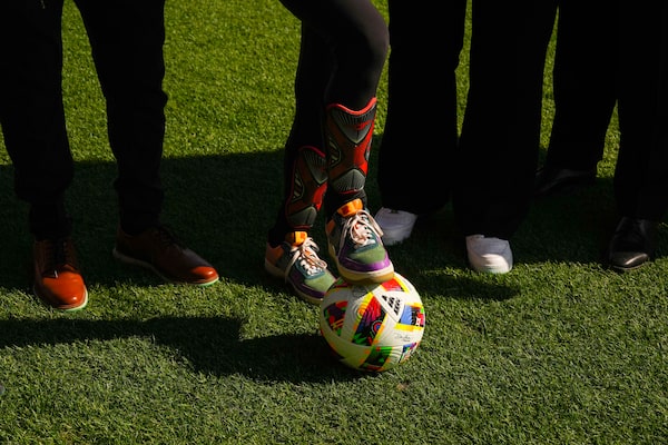 Mayor Olivia Chow sports shin pads at a funding announcement for Toronto's FIFA World Cup hosting effort in May, 2024.Chris Young/The Canadian Press