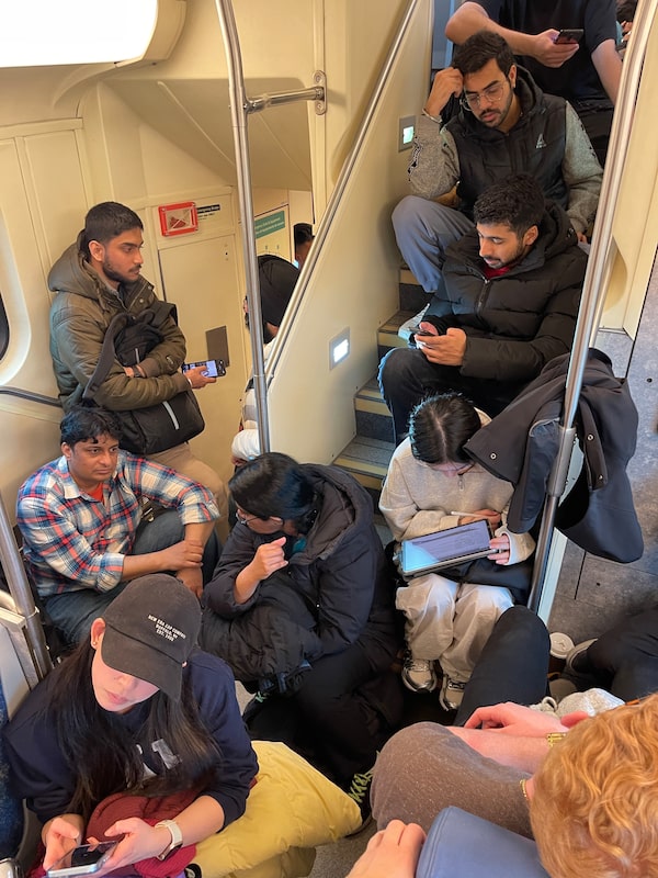 By 2:04 p.m., forlorn visitors were looking up in disappointment – except A.J. Jiang, 34, and Maria Guardado, 25, who were dancing in front of a Bluetooth speaker pumping out Taylor Swift’s Love Story. “We met on the GO train this morning,” Ms. Guardado said, hugging Mr. Jiang, who was wearing a rainbow faux-fur jacket. “And we may have had some edibles.”