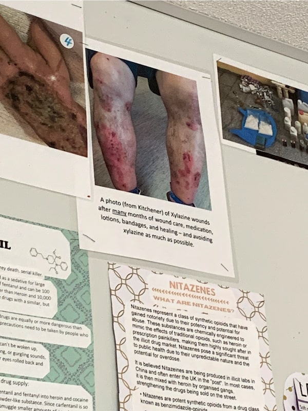 At this safe-consumption site in Kitchener, a bulletin board warns drug users of the wounds that can result from using xylazine.Marcus Gee/The Globe and Mail