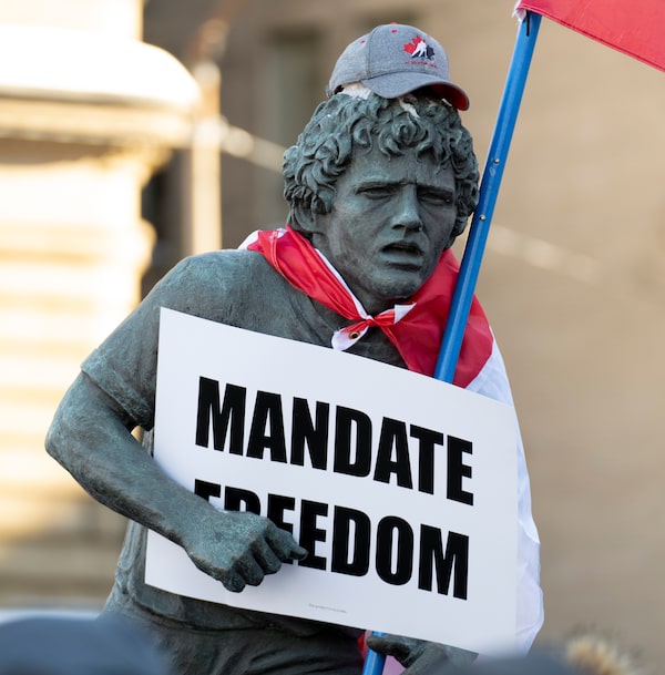 A statue of Terry Fox is draped with a Canadian flag, protest sign and hat as protesters from a cross-country truck convoy participate in a demonstration against vaccine mandates on Parliament Hill on Saturday, Jan. 29, 2022.Adrian Wyld/The Canadian Press
