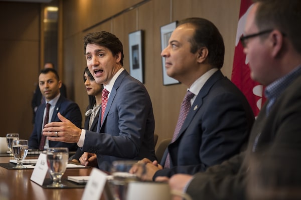 Prime Minister Justin Trudeau, alongside Liberal MPs, from the left, Marwan Tabbara, Bardish Chagger and Raj Saini meet with Region of Waterloo mayors and delivers brief opening remarks in Kitchener, Ont., on April 17, 2019.Christopher Katsarov/The Canadian Press