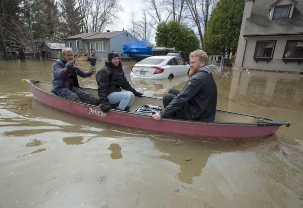 Residents paddle through flooded streets after a dike broke causing widespread flooding and forcing thousands of people to evacuate April 28, 2019 in Ste.Marthe-sur-la-Lac, Que.Ryan Remiorz/The Canadian Press