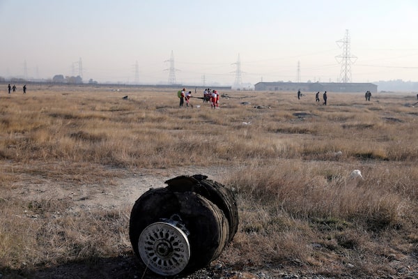 Debris from Ukrainian Airlines Flight 752 lays on the ground as rescue workers search southwest of Tehran on Jan. 8, 2020.Ebrahim Noroozi/The Associated Press