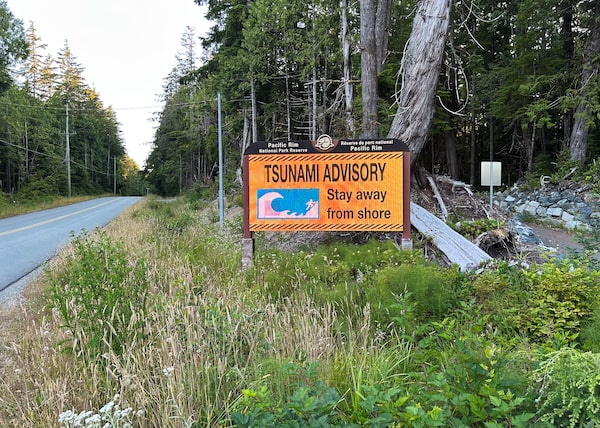 A tsunami advisory sign is seen near Wickaninnish Beach at Pacific Rim National Park near Tofino, B.C., on Tuesday.Dirk Meissner/The Canadian Press