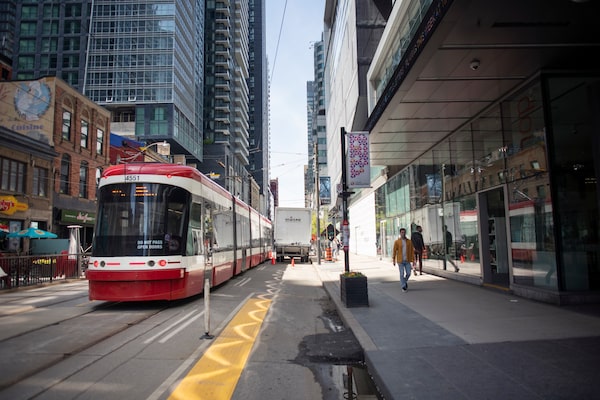 A westbound TTC streetcar on King Street West on May 6. The TTC currently carries about 1.4 million passengers a day, and any shutdown could hurt its efforts to recover from the COVID-19 pandemic.Fred Lum/The Globe and Mail