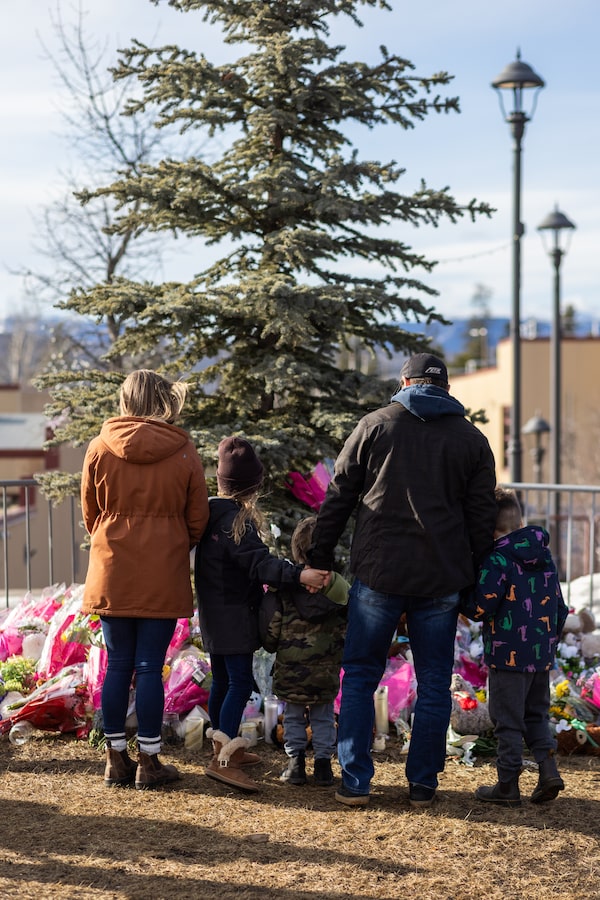 A family places flowers at a memorial in Tumbler Ridge.JESSE WINTER/The Globe and Mail