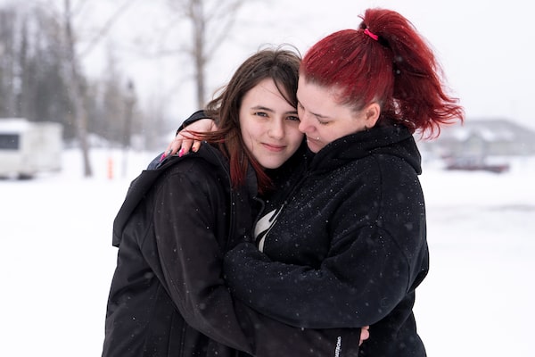 Maddy Mansky, 12, is held by her mother Alysha Mansky in Tumbler Ridge, B.C., on Monday. Maddy hid in the washroom while the shooter attacked the school.Jimmy Jeong/The Globe and Mail