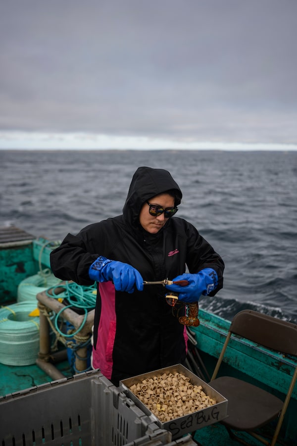 Mi'kmaq fisher Kaitlin Marr bands lobsters on the Sea Bug.Darren Calabrese/The Globe and Mail