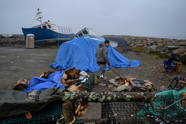 A man tends to a fire at a checkpoint set up by the Sipekne'katik First Nation at the wharf in Saulnierville, N.S.Darren Calabrese/The Globe and Mail