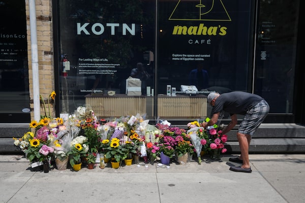 Flowers are shown at a makeshift memorial at the place where a mother of two, Karolina Huebner-Makurat, was killed by a stray bullet in Toronto, on July 10.Chris Young/The Canadian Press