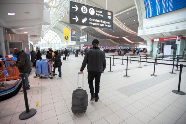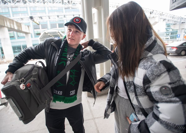 Eighteen-year-old Yaroslav Hrytsiuk, left, is accompanied by Valery Kryvosheina, 17, to Toronto Pearson International Airport on March 1, 2022. Mr. Hrytsiuk, who has dual citizenship, plans to go back to Ukraine to help defend his home country following Russia's invasion last week.Fred Lum/The Globe and Mail