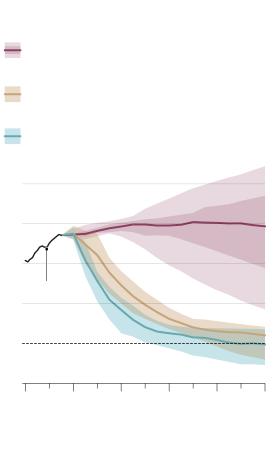 With implemented policies to date (with 50% likelihood and 90% likelihood ranges)
