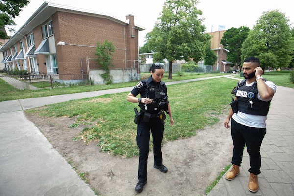 Windsor police Const. Jordyn Thompson and and ER nurse Abbas Haidar attend the Homelessness and Housing Help Hub (H4) in June.Dax Melmer/The Globe and Mail